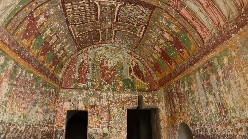 Sabah kahvaltımızı yaptıktan sonra, Bizans Sanatının Anadolu’daki en güzel örneklerinden biri olan GÜMÜŞLER MANASTIRI’na gidiyoruz. Büyük bir kaya kilisenin içine oyulan manastır, Kapadokya bölgesindeki en büyük manastırlardan birisi ve 10. yüzyıl Bizans sanatının Anadolu’daki günümüze iyi korunarak gelmiş örneklerindendir. 1973 yılında arkeolojik sit alanı ilan edilmiştir. Kare planlı bir orta avlu, bu avluya bağlanan kilise ve yer altı mekânlarından oluşur. Manastır bölgesi; yeraltı şehri, dış kalıntılar ve kilise ile yaklaşık 1.5 kilometre çapında bir alanı kaplıyor. Manastırın bazı bölümleri 7. yüzyılda oyulmuş, ancak fresklerin çoğunun 11. ve 12. yüzyıla ait olduğu düşünülüyor. İllginç betimlemeleri ve dünyada başka bir örneği olmayan,”GÜLEN MERYEM” freski manastırın en büyük özelliği. Belki de bir restorasyon hatası…